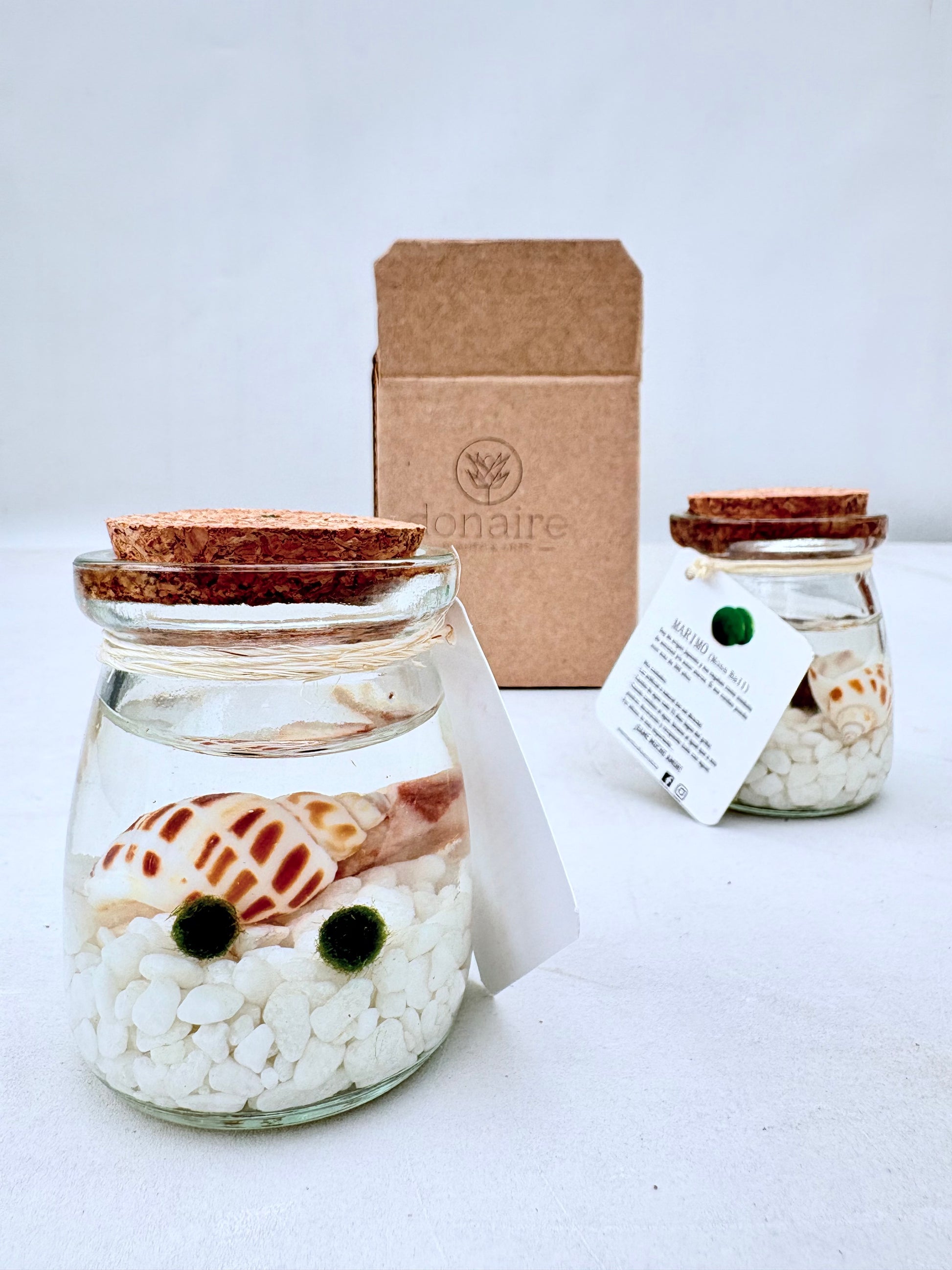Marimo pequeño doble en contenedor de vidrio de 7 cm de alto * 5,5 cm de diámetro.
